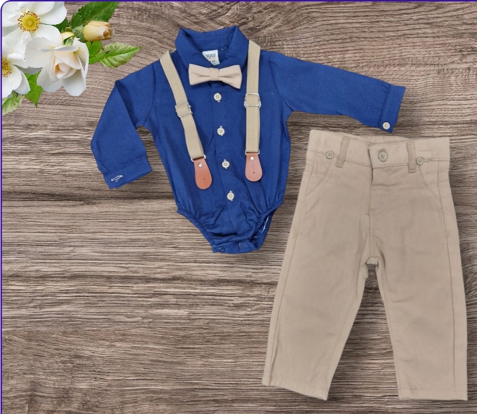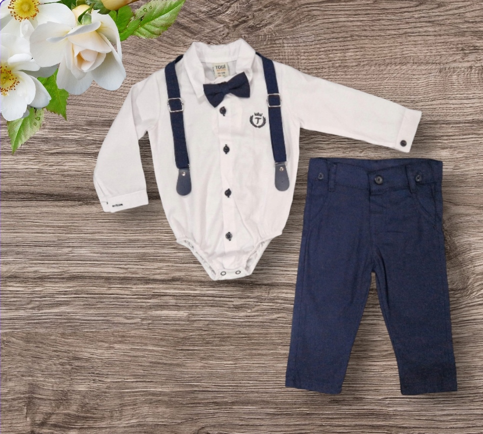 Komplet : hlače u tamnoplavoj ili bež boji, bodi/košulja u bijeloj ili tamnoplavoj boji, tregeri, leptir mašna.