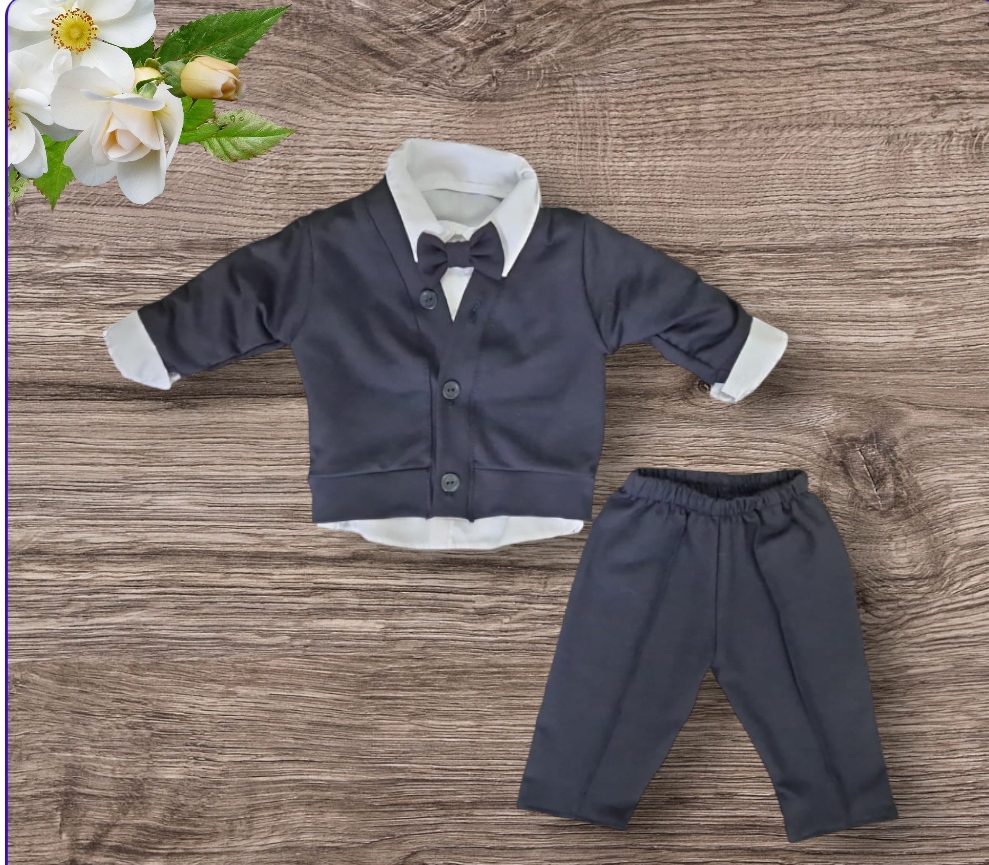 Svečani komplet, koji se sastoji od tamno-plavih hlača, bijele košulje, tamno-plave veste i leptir mašne.