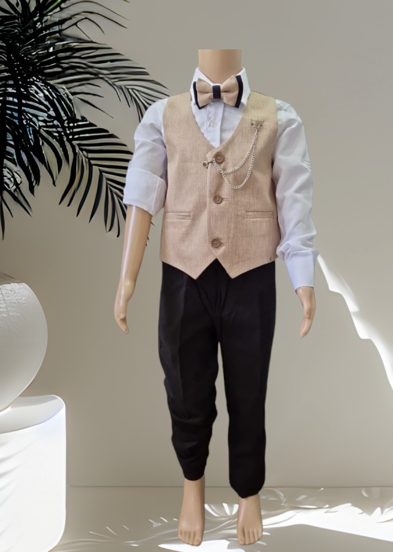 Svečani komplet koji se sastoji od hlača u crnoj boji, bijele košulje, prsluka u bež boji i leptir mašne.